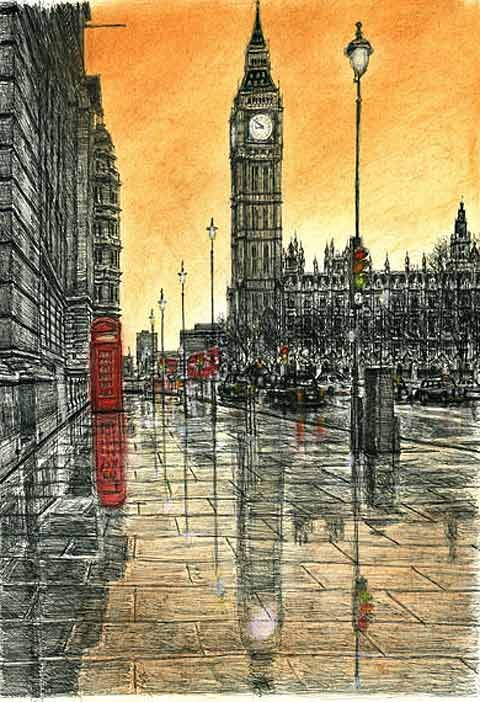 He also draws fictional scenes, for example, St. Paul’s Cathedral surrounded by flames.