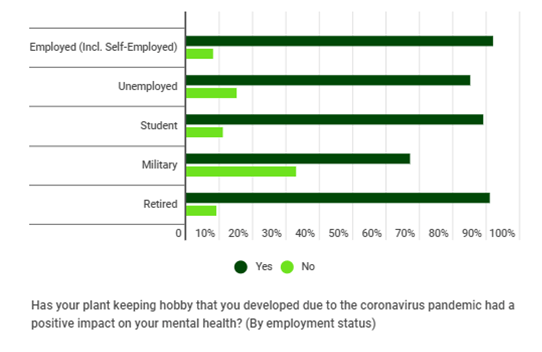 The benefits of plant-keeping also extended to physical health for some survey respondents. More men said they experienced positive physical effects from keeping plants, than women. Students were the most likely group to say plant-keeping is having a positive impact on their physical health. Military personnel found the activity less helpful for physical health benefits, perhaps because they were already fit.