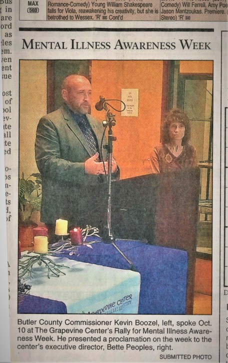 Boozel read the Butler County Proclamation which acknowledges the problem and recognizes Mental Illness Awareness Week, then presented it to Bette Peoples, the executive director of Grapevine Center.