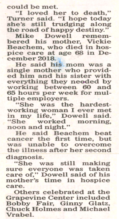 Mike Dowel appreciating his mom, Vickie Beachem former Grapevine employee