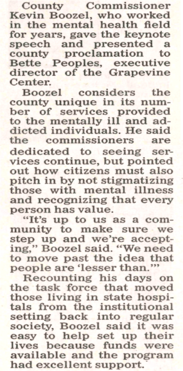 At a touching ceremony on Wednesday October 10th, Grapevine Center highlighted Mental Illness Awareness Week by commemorating the deaths of eight of their members. The keynote speaker was County Commissioner Kevin Boozel who has a background in Mental Health care.